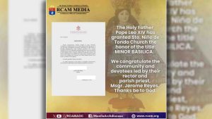2,915 total views Inaprubahan na ni Pope Leo XIV ang kahilingan ng Archdiocesan Shrine of Santo Niño sa Tondo, Manila na maitaas ito bilang isang minor