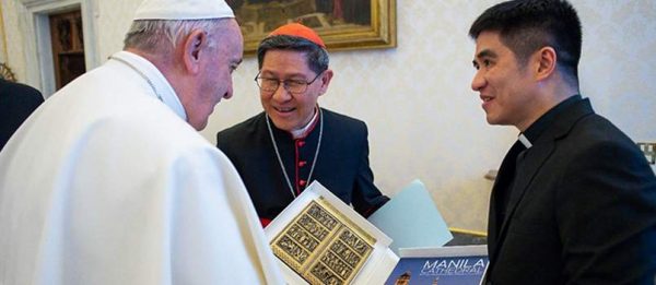 399 total views Personal na nakatanggap ang Kanyang Kabanalan Francisco ng Manila Cathedral Coffee Table Book,Restoring a Monument to Faith, Architecture and History, noong lunes, ika-20