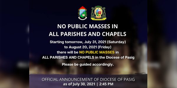 Pansamantalang sinuspinde ng Diocese of Pasig ang pagsasagawa ng public Masses sa lahat ng mga parokya at kapilya sa Diyosesis. Magsisimula ang suspensyon ng pagsasagawa