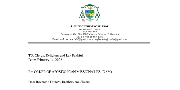 Nagbabala ang Archdiocese of Cagayan de Oro sa mga mananampalataya hinggil sa grupo na nagpapakilalang kongregasyon upang makapangalap ng mga donasyon. Sa inilabas na liham