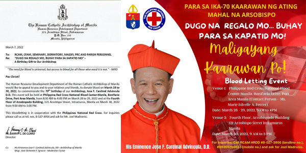 Magsasagawa ng bloodletting activity ang Archdiocese of Manila bilang paggunita sa ika-70 kaarawan ni Manila Archbishop Jose Cardinal Advincula. Tema nito ang “Dugo na Regalo