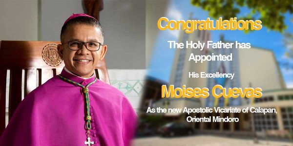 3,226 total views Itinalaga ng Santo Papa Francisco si Zamboanga Administrator at Auxiliary Bishop Moises Cuevas bilang obispo ng Apostolic Vicariate of Calapan, Oriental Mindoro. Isinapubliko