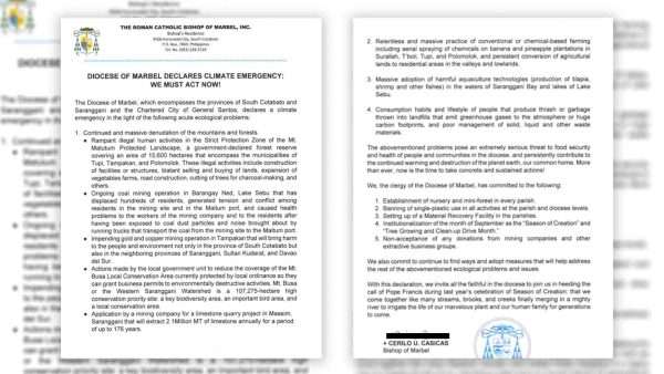 Nagdeklara ng climate emergency ang Diocese of Marbel bilang panawagan laban sa umiiral na suliraning pangkalikasan sa kinasasakupang mga lalawigan sa Soccsksargen Region. Noong ika-15