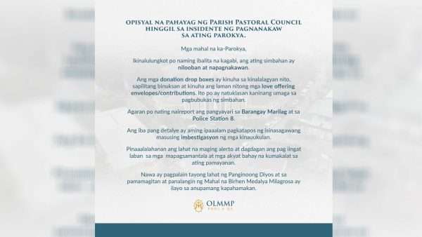 Naglabas ng pahayag ang Parish Pastoral Council ng Our Lady of the Miraculous Medal Parish (OLMMP) sa Project 4, Quezon City kaugnay sa insidente ng