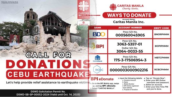 Tutulong ang Caritas Manila sa mga Cebuanong lubhang naapektuhan ng 6.9 magnitude na lindol na puminsala sa lalawigan noong Setyembre 30. Ayon kay Fr. Anton