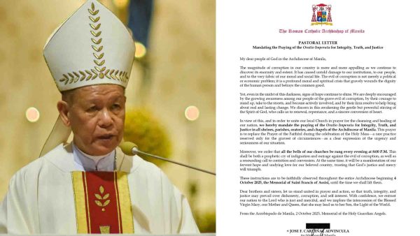 Ipinag-utos ni Manila Archbishop Jose Cardinal Advincula ang pagdarasal ng Oratio Imperata para sa integridad, katotohanan at katarungan sa lahat ng parokya, oratoryo, kapilya at
