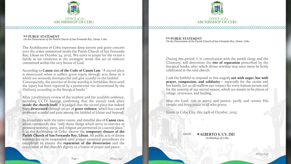 Mariing kinondena ng Archdiocese of Cebu ang karahasang naganap sa loob ng San Fernando El Rey Parish sa Liloan, Cebu noong Oktubre 24, 2025, kung