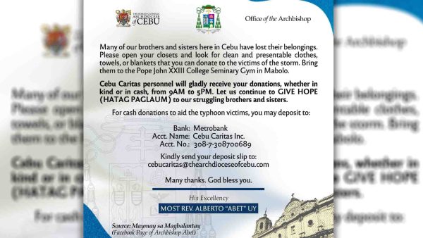 Nanawagan si Cebu Archbishop Alberto Uy sa mamamayan ng Cebu na magkaisa sa pagtulong sa mga pamilyang naapektuhan ng bagyong Tino, na nanalasa sa lalawigan.