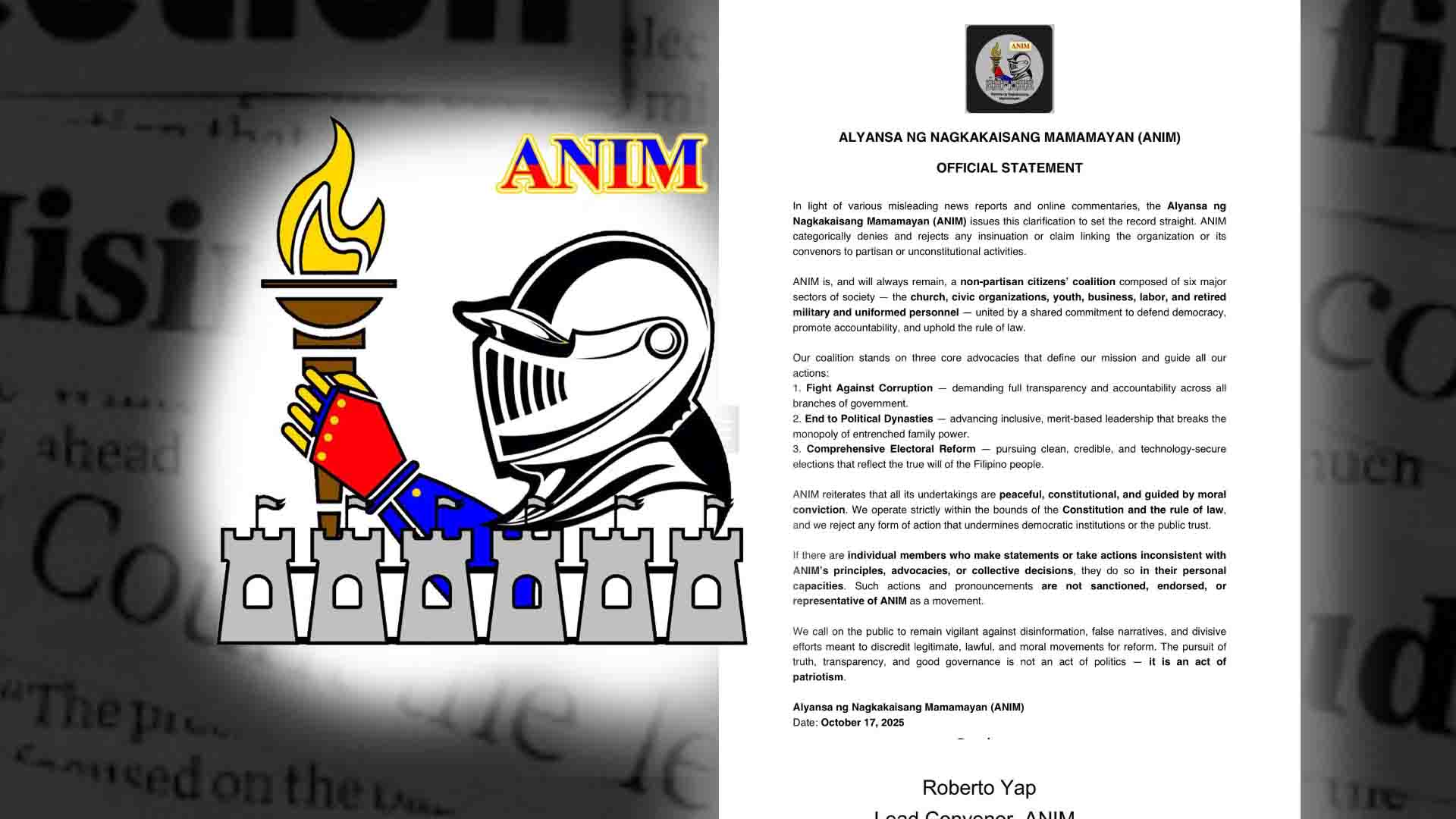 “In light of various misleading news reports and online commentaries, the Alyansa ng Nagkakaisang Mamamayan (ANIM) issues this claritication to set the record straight. ANIM calegorically denies and rejects any insinuation or claim linking the organization or its convenors to partisan or unconstitutional activities. ANIM is, and will always remain, a non-partisan citizens’ coalition composed of six major sectors of society – the church, civic organizations, youth, business, labor, and retired military and uniformed personnel – united by a shared commitment to defend democracy. promote accountability, and uphold the rule of law.” Bahagi ng pahayag ng ANIM.