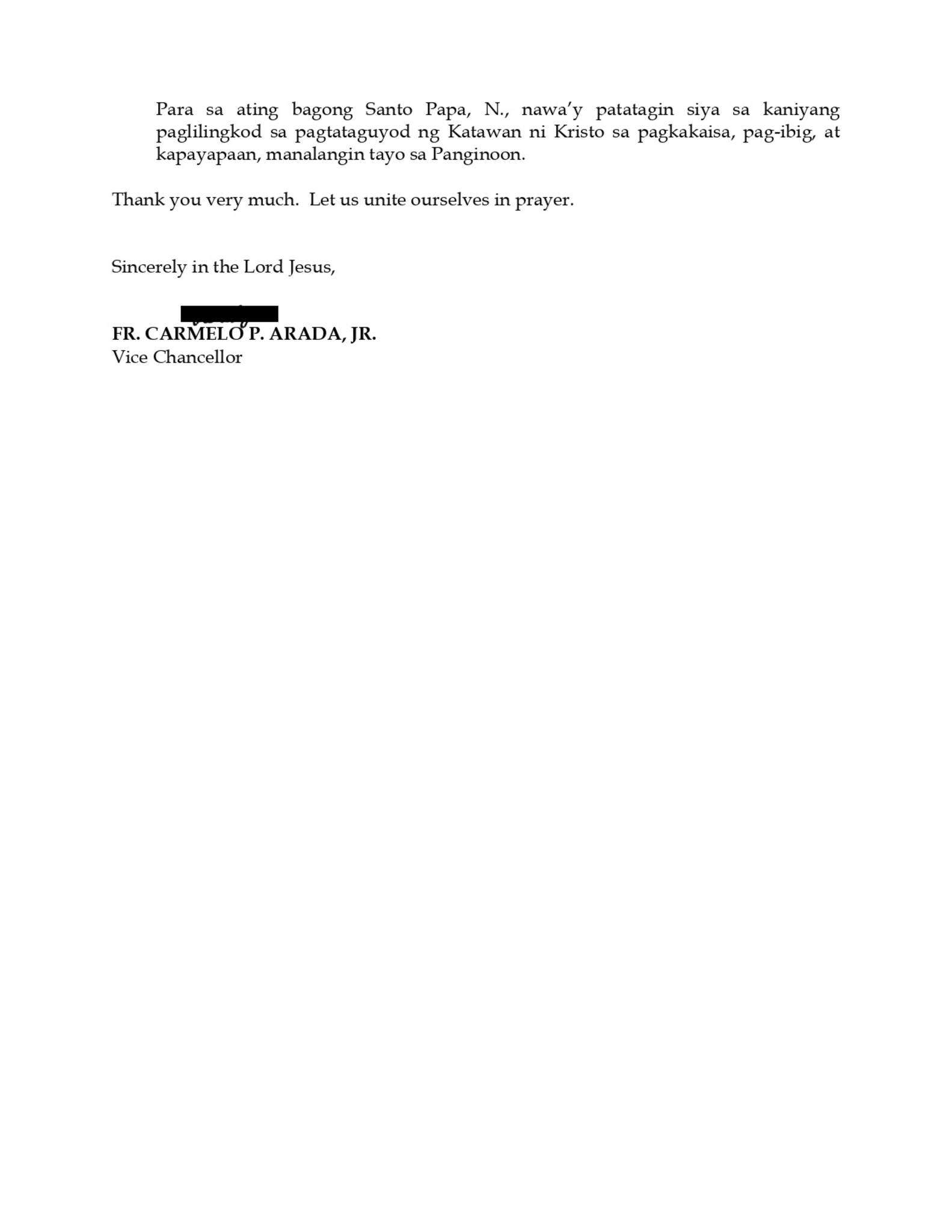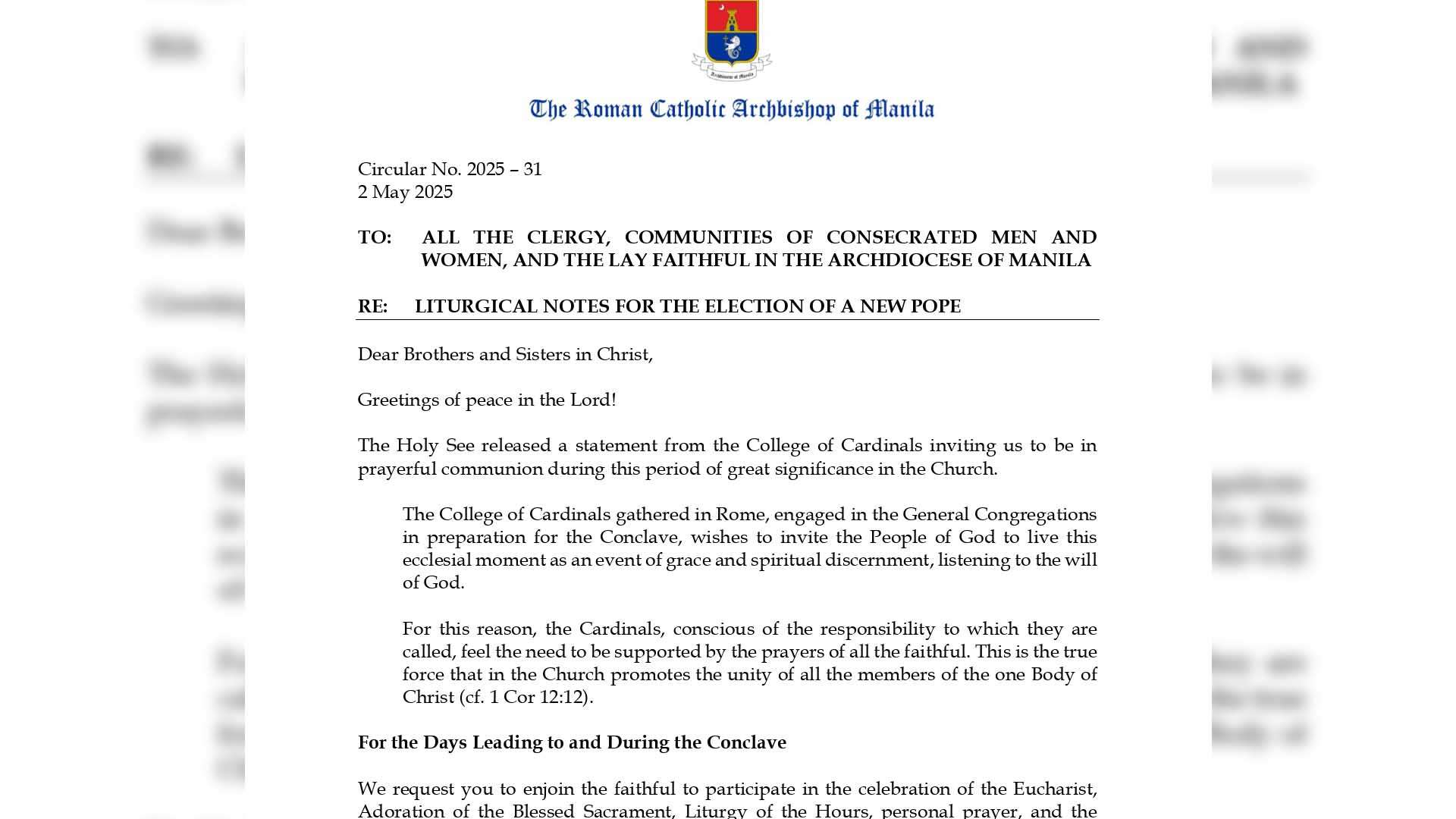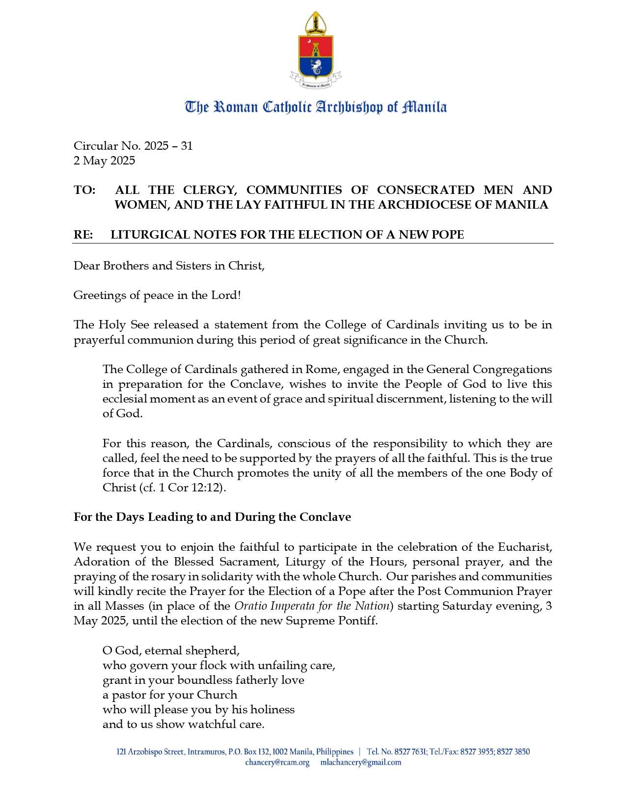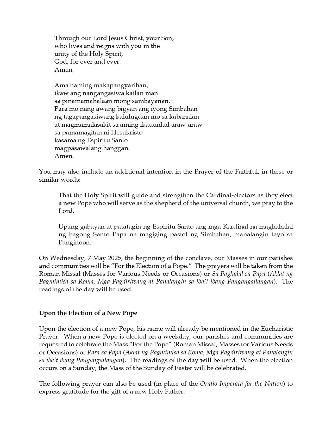Kabilang dito ang pag-usal sa lahat ng Misa ng Panalangin para sa Pagpili ng Santo Papa matapos ang Panalangin pagkatapos ng Pakikinabang, kapalit ng Oratio Imperata para sa Bayan, simula ngayong Sabado ng gabi, May 3, 2025, hanggang sa pagkahalal ng bagong punong pastol ng Simbahang Katolika.