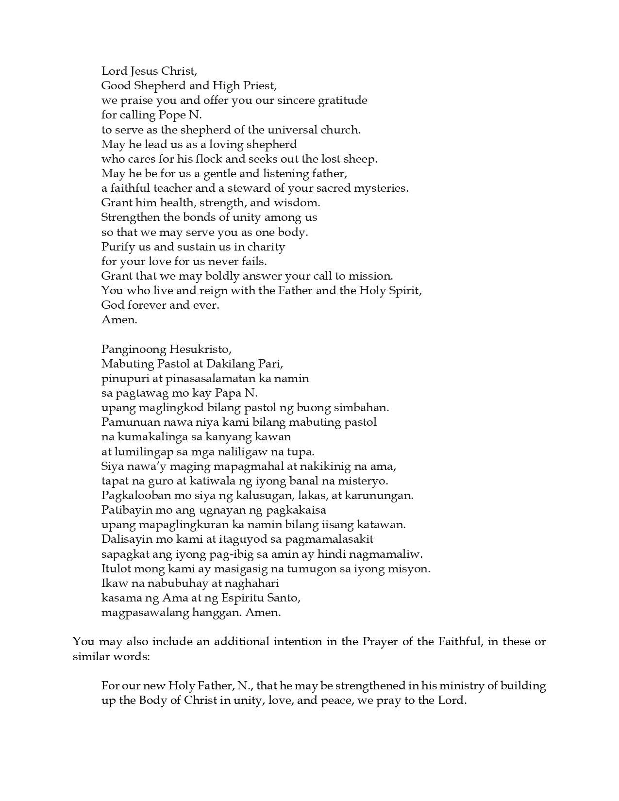 Kapag napili at naihalal na ang bagong Santo Papa, babanggitin na ang kanyang pangalan sa Eucharistic Prayers, gayundin ang pag-usal ng panalangin ng pasasalamat para sa pagkakaloob ng bagong pinuno ng Simbahang Katolika, o kaya’y pagdadagdag ng karagdagang intensyon sa Panalangin ng Bayan.