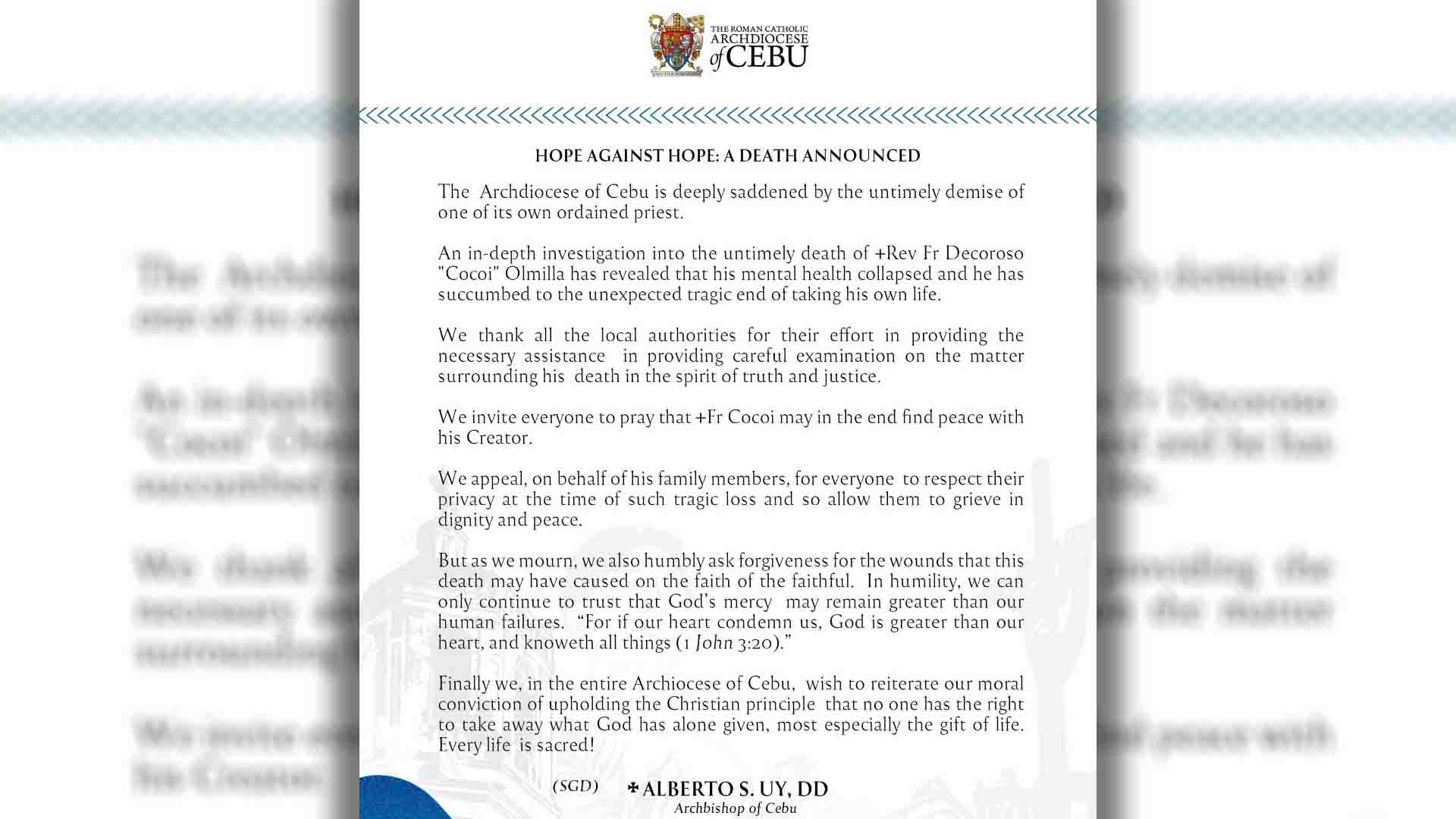 “An in-depth investigation… has revealed that his mental health collapsed and he has succumbed to the unexpected, tragic end of taking his own life. We appeal, on behalf of his family members, for everyone to respect their privacy… and allow them to grieve in dignity and peace,” pahayag ni Archbishop Uy.