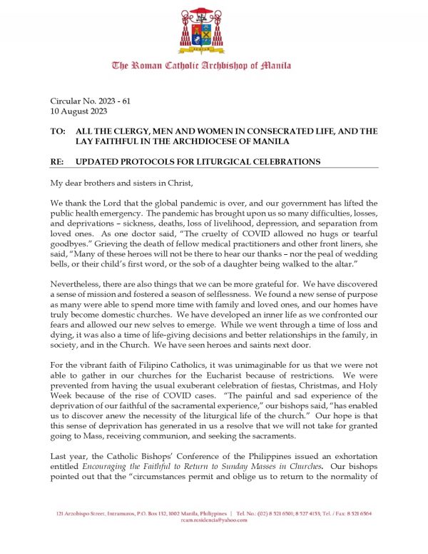 Muling naglabas ng panuntunan ang Archdiocese of Manila sa mga gawaing simbahan makaraang alisin ng pamahalaan ang public health emergency status sa bansa dulot ng COVID-19.
