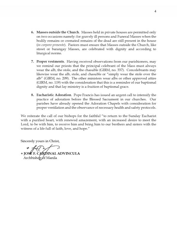 Ipinaalala din ng arsobispo sa pagdiriwang ng Banal na Misa sa labas ng mga simbahan na tiyaking nasusunod ang wastong liturhiya at nabibigyang dignidad ang pagdiriwang ng Eukaristiya gayundin ang pagsusuot ng wastong kasuotan ng mga pari ayon sa GIRM.
