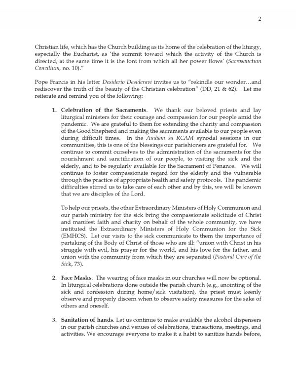 Bagamat optional na ang pagsusuot ng facemask sa mga gawain, hinimok ni Cardinal Advincula ang mga pari na panatilihin ang safety protocol lalo na sa pagbisita sa mga maysakit habang ipinag-utos din nito ang pananatili ng alcohol dispensers sa mga simbahan at ugaliin ang pag-sanitize ng kamay sa lahat ng pagkakataon lalo na sa komunyon.