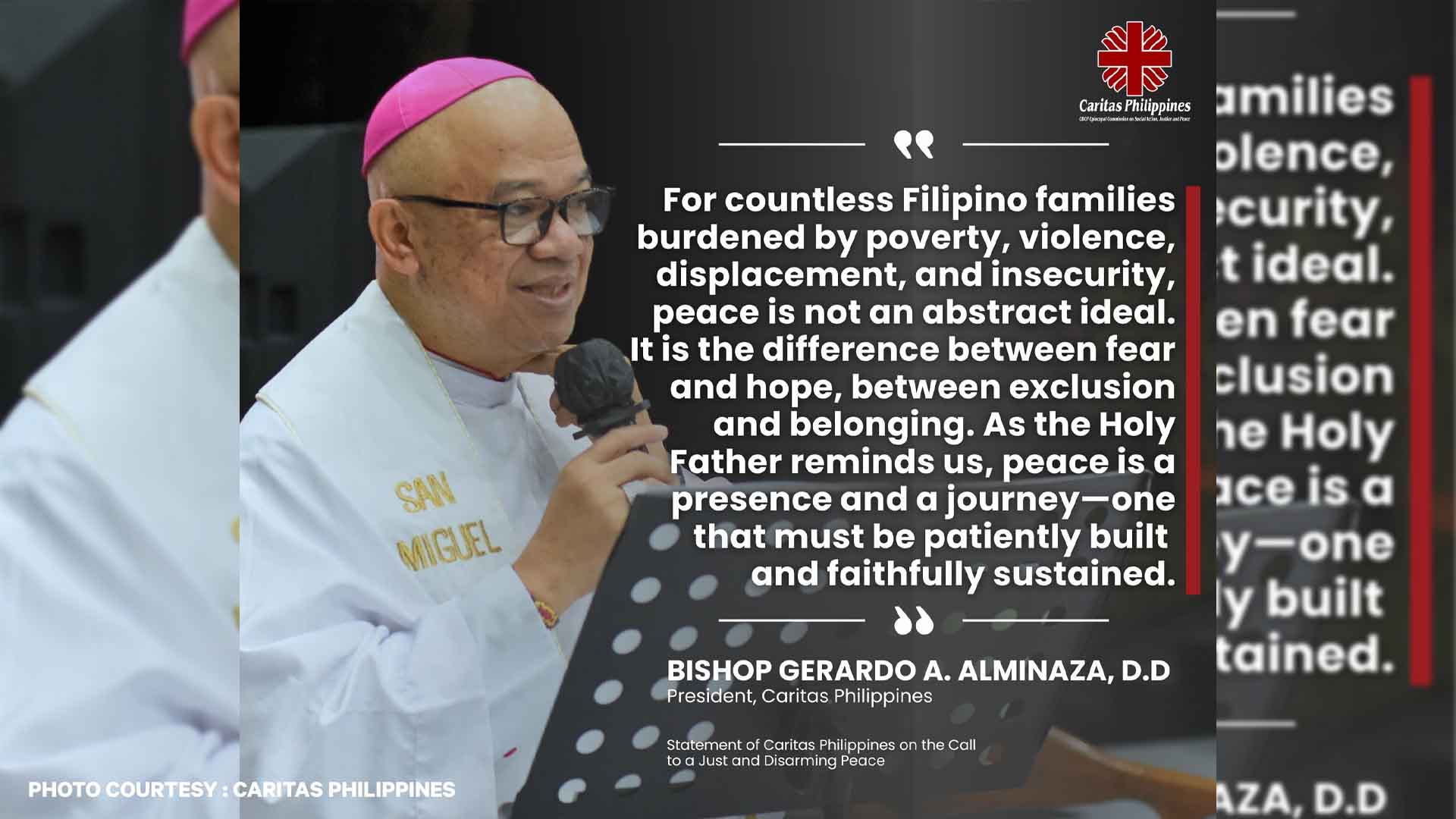 Mariin ding kinondena ng Caritas Philippines ang paniniwalang ang seguridad ay nakukuha sa pamamagitan ng militarisasyon at dahas. Iginiit ng Obispo na ang tunay at pangmatagalang kapayapaan ay nagmumula sa katarungan, dayalogo, at pagpapanumbalik ng nasirang ugnayan, lalo na sa mga komunidad na matagal nang pinagkaitan ng boses at karapatan.