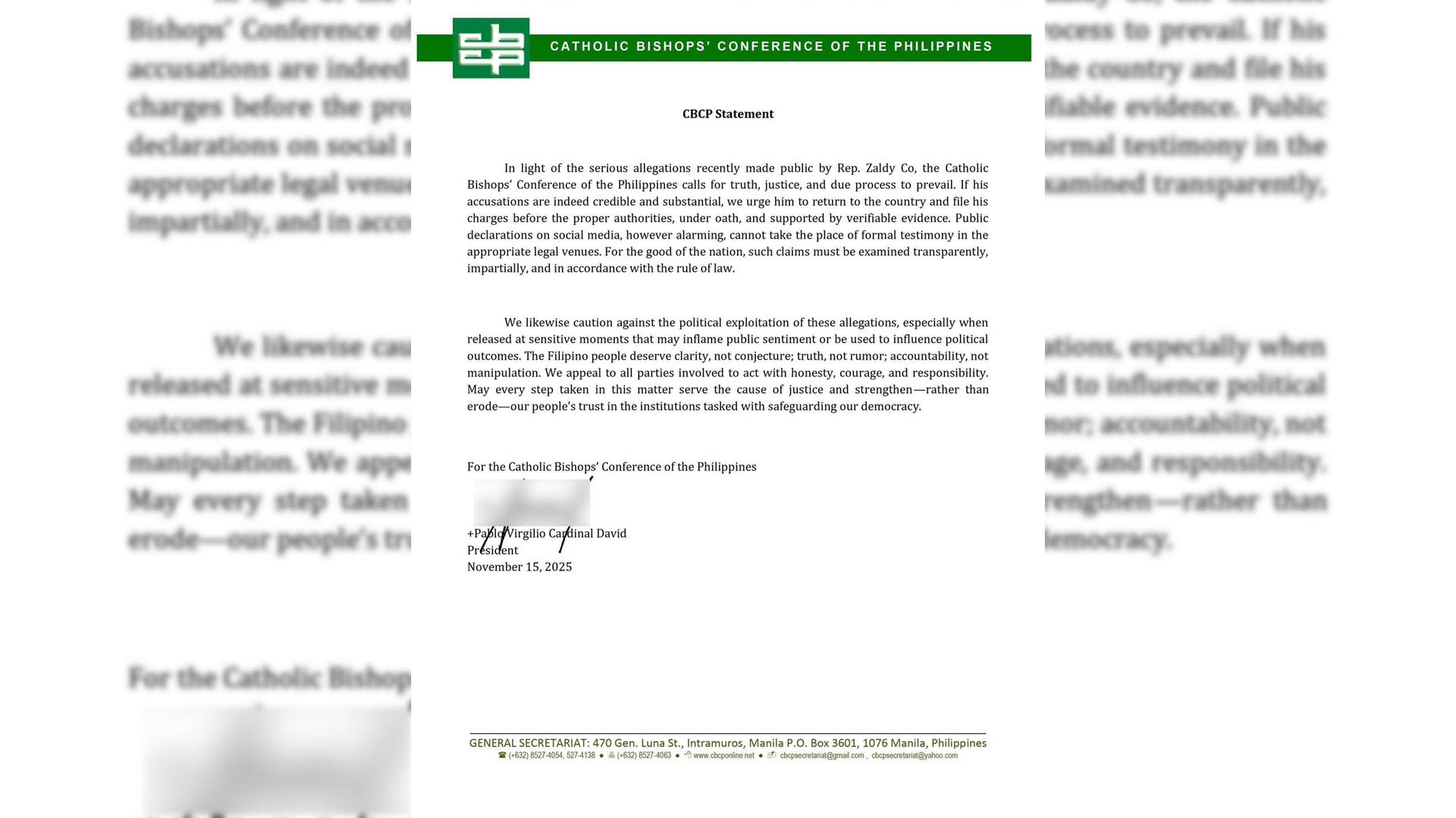 Nananawagan ang Catholic Bishops’ Conference of the Philippines (CBCP) na pairalin ang katotohanan, katarungan, at tamang proseso kaugnay ng mga paratang na inilabas ni dating Ako Bicol party-list Rep. Zaldy Co.