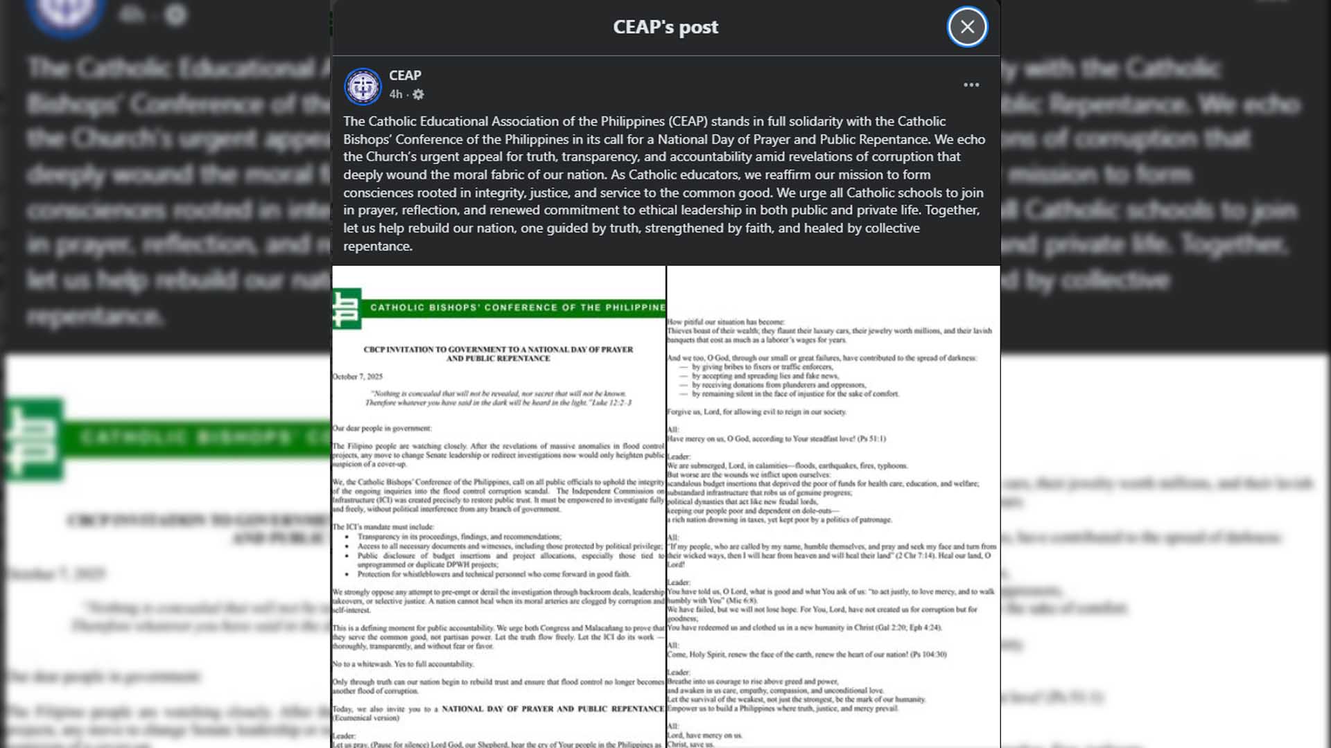 “The Catholic Educational Association of the Philippines (CEAP) stands in full solidarity with the Catholic Bishops’ Conference of the Philippines in its call for a National Day of Prayer and Public Repentance. We echo the Church’s urgent appeal for truth, transparency, and accountability amid revelations of corruption that deeply wound the moral fabric of our nation,” ayon sa pahayag at pakikiisa ng CEAP.