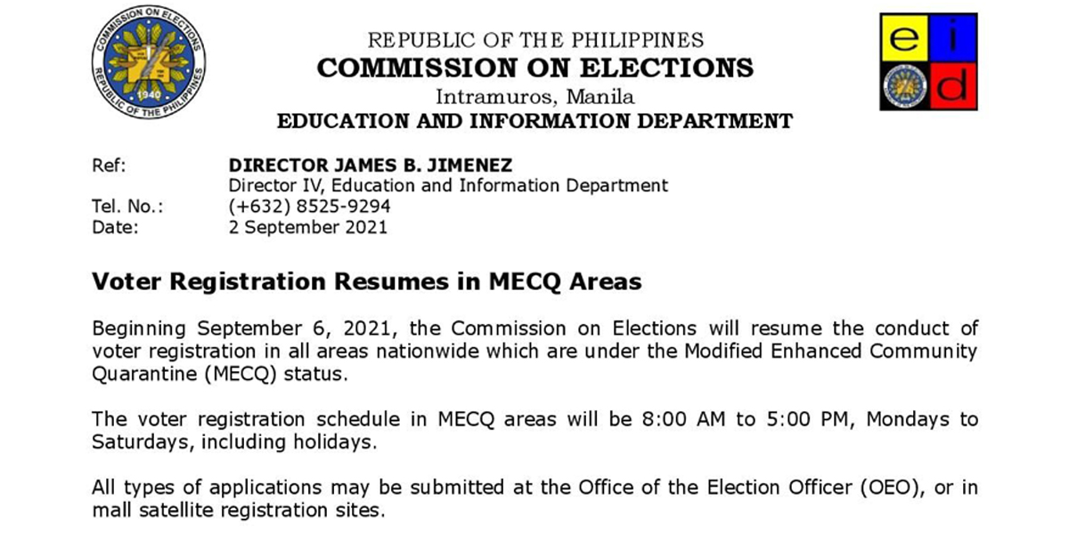 “Beginning September 6, 2021, the Commission on Elections will resume the conduct of voter registration in all areas nationwide which are under the Modified Enhanced Community Quarantine (MECQ) status. The voter registration schedule in MECQ areas will be 8:00AM to 5:00PM, Mondays to Saturdays, including holidays. All types of applications may be submitted at the Office of the Election Officer (OEO), or in mall satellite registration sites,” anunsyo ni Jimenez.