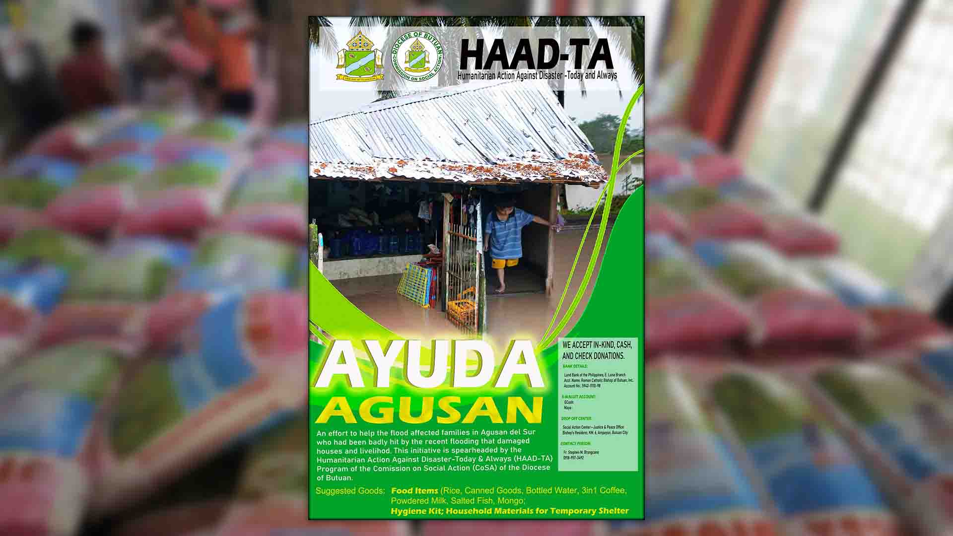 Inilunsad ng diyosesis ang Ayuda Agusan sa pangunguna ng Humanitarian Action Against Disaster-Today & Always (HAAD-TA) Program ng Diocese of Butuan Commission on Social Action.