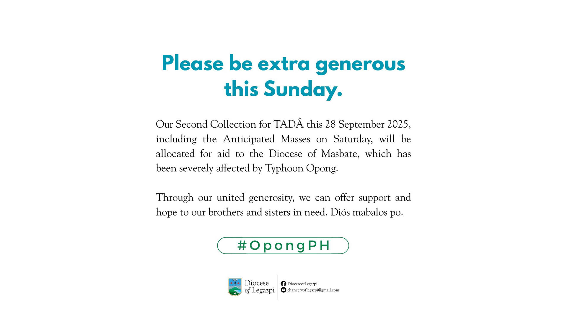 Sa inilabas na panawagan ng Diyosesis ng Legazpi, ang second collection na nakatakda para sa programa ng diyosesis na Tanganing an Dukha Atamanon (TADA), ay ilalaan para sa pagtulong para sa mga nasalanta ng kalamidad sa Diyosesis ng Masbate.