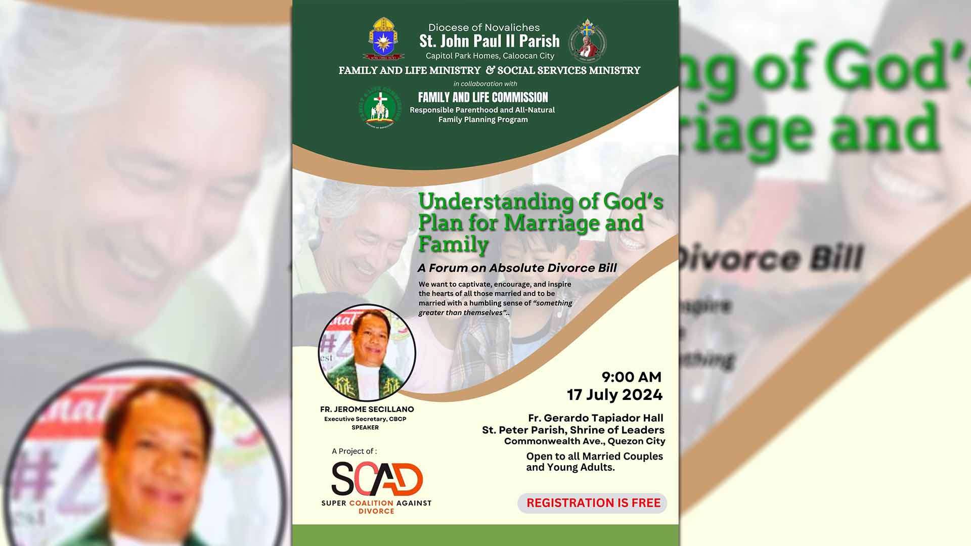 Para lalong maunawaan ang negatibong epekto sa pagsasabatas ng divorce ay magsasagawa ng Forum on Absolute Divorce Bill na may titulong “Understanding God’s Plan on Marriage and Family” ang Family and Life Ministry and Social Services Ministry ng St. John Paul II Parish, Diocese of Novaliches – Family and Life Commission, Responsible Parenthood and All-Natural Family Planning Program, at Super Coalition Against Divorce (SCAD).