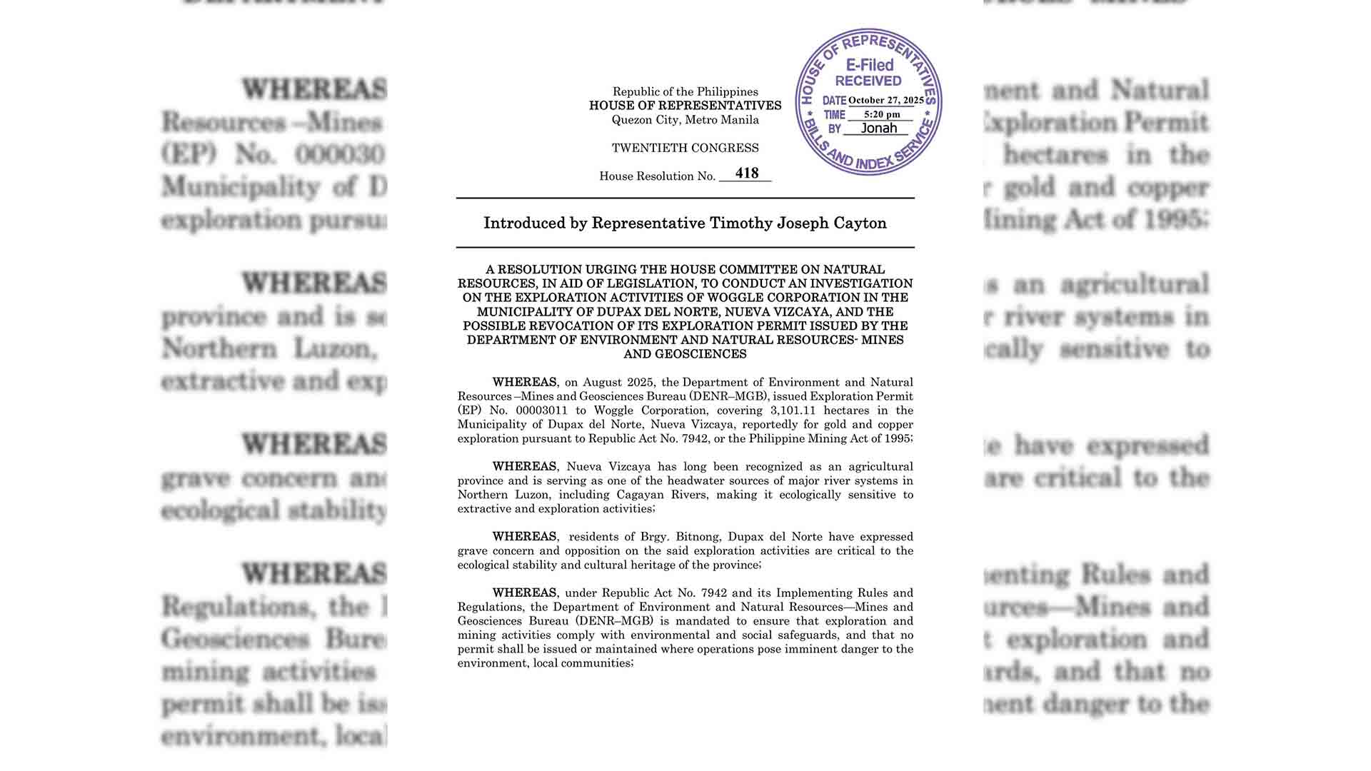 Sa liham ni MGB Assistant Secretary for Mining Concerns at OIC Director Michael Cabalda kay Woggle Corporation President Tommy Alfonso noong February 5, 2026, ipinag-utos ang agarang suspension ng lahat ng exploration activities ng kumpanya dahil sa umiiral na “force majeure,” kabilang ang mga barikadang humarang sa pagpasok sa permit area.