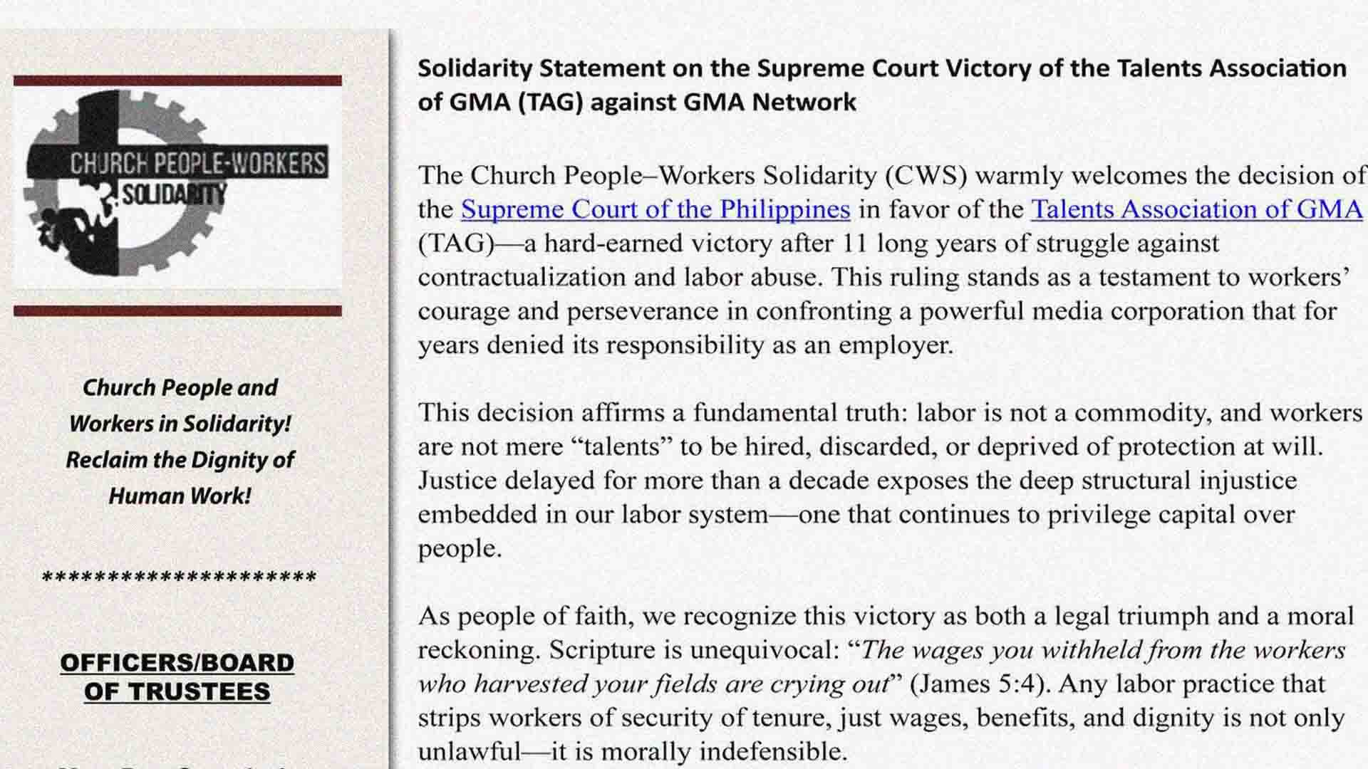 Ang suporta ng CWS ay kasunod ng pagkapanalo ng 94 na manggagawa ng isa sa pinakamalalaking media broadcasting network sa bansa sa isang labor case na umabot ng 11 taon.