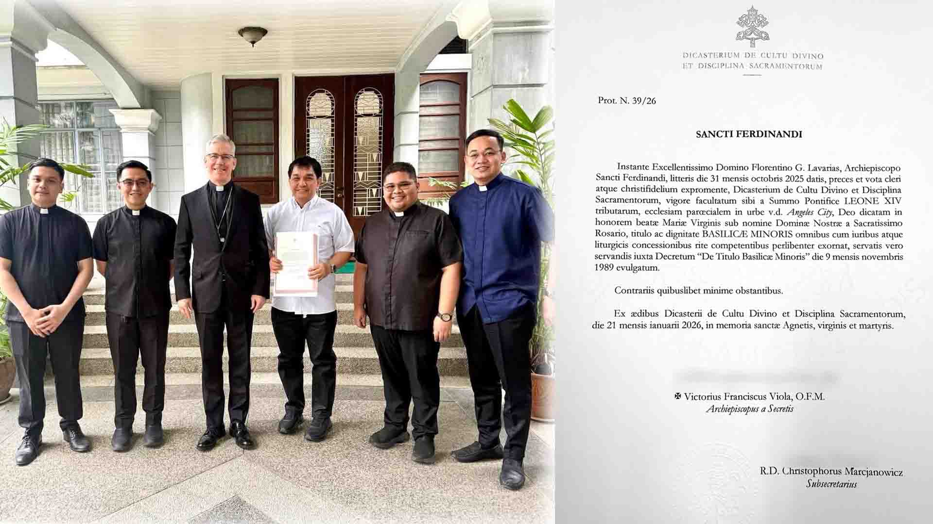 Personal na pinangunahan ni Rev. Fr. Manuel Sta. Maria, kura paroko ng Holy Rosary Parish (HRP) sa Angeles City ang pagtanggap sa opisyal na Decree (Prot. N 39/26) na nagdedeklara sa parokya bilang isang bagong Minor Basilica ngayong ika-10 ng Pebrero, 2026.