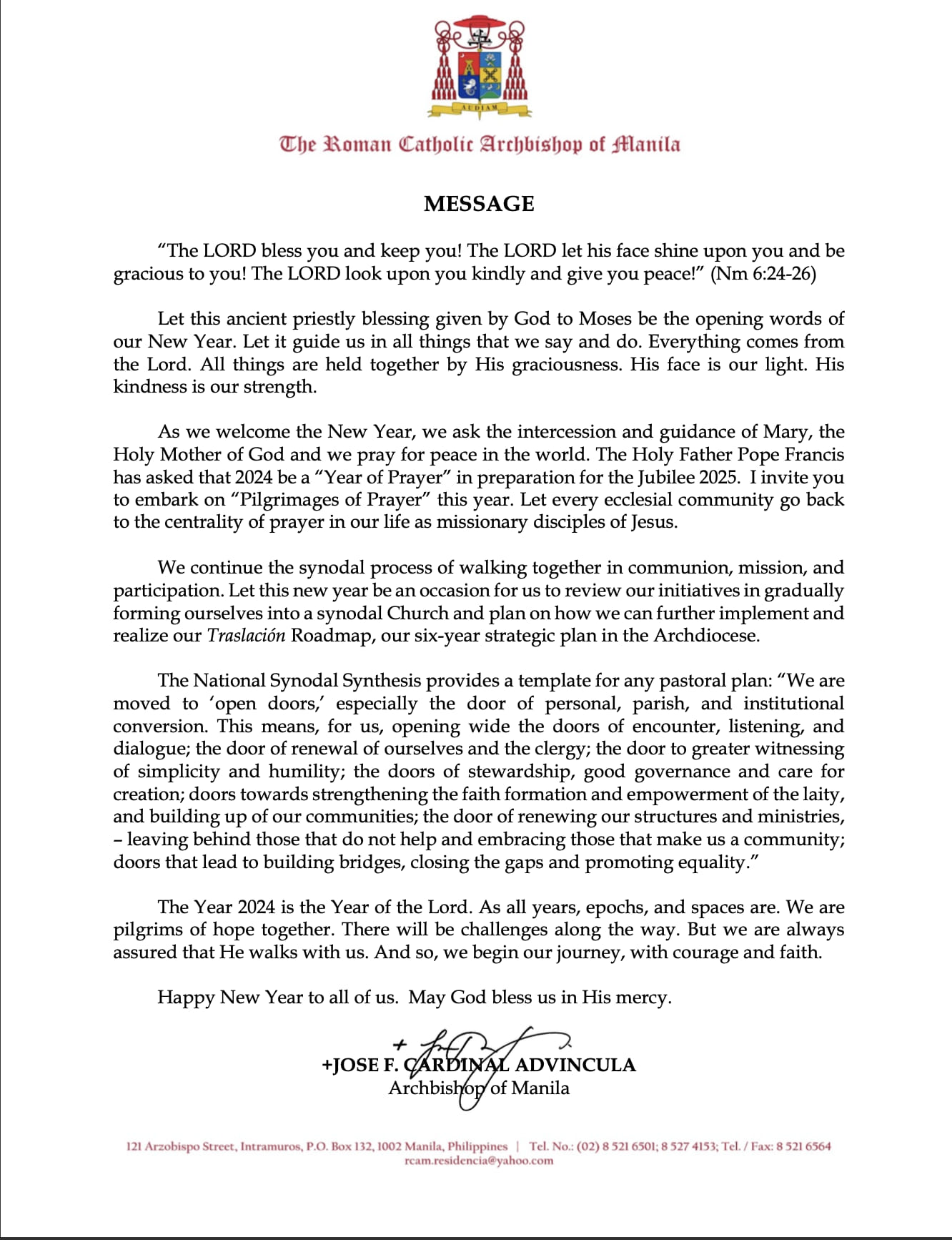 “We continue the synodal process of walking together in communion, mission, and participation.Let this new year be an occasion for us to review our initiatives in gradually forming ourselves into a synodal Church and plan on how we can further implement and realize our Traslacion Roadmap, our six-year strategic plan in the Archdiocese,” ani Cardinal Advincula.