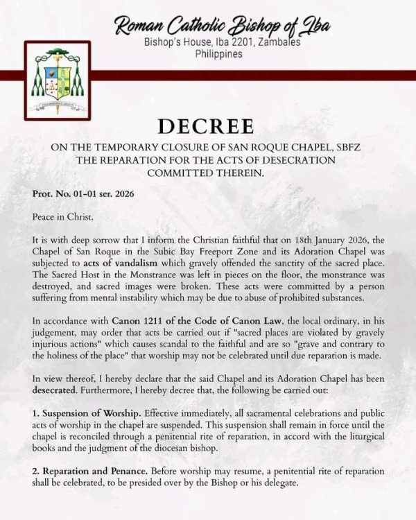 “It is with deep sorrow that I inform the Christian faithful that on 18th January 2026, the Chapel of San Roque in the Subic Bay Freeport Zone and its Adoration Chapel was subjected to acts of vandalism which gravely offended the sanctity of the sacred place. The Sacred Host in the Monstrance was left in pieces on the floor, the monstrance was destroyed, and sacred images were broken.” Bahagi ng pahayag ni Bishop Santos.
