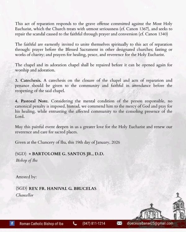 Batay sa inilabas na atas ni Bishop Santos na may petsang January 19, 2026, kabilang sa nilapastangan ang katawan ni Kristo (sacred host) gayundin ang monstrance at ilang mga banal na imahe.