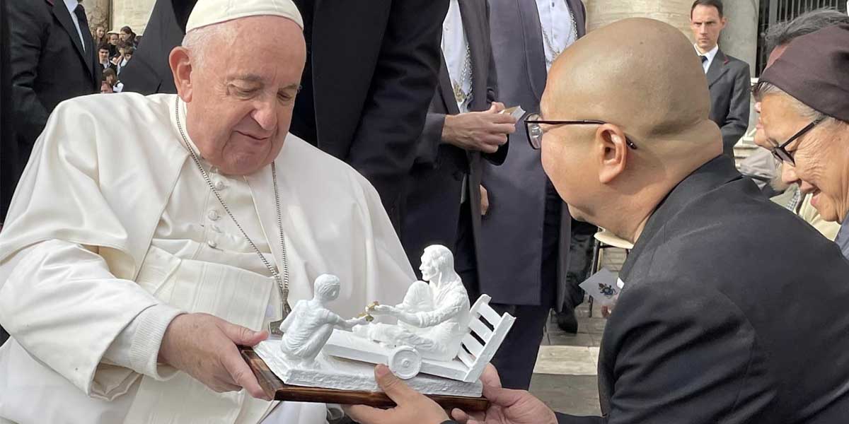 Personal na tinanggap ng Kanyang Kabanalan Francisco ang handog na likhang sining ni Rev. Fr. Flavie Villanueva, SVD – founder ng St. Arnold Janssen Kalinga Center sa weekly audience ni Pope Francis sa St. Peter’s Square sa Vatican noong ika-16 ng Nobyembre, 2022.