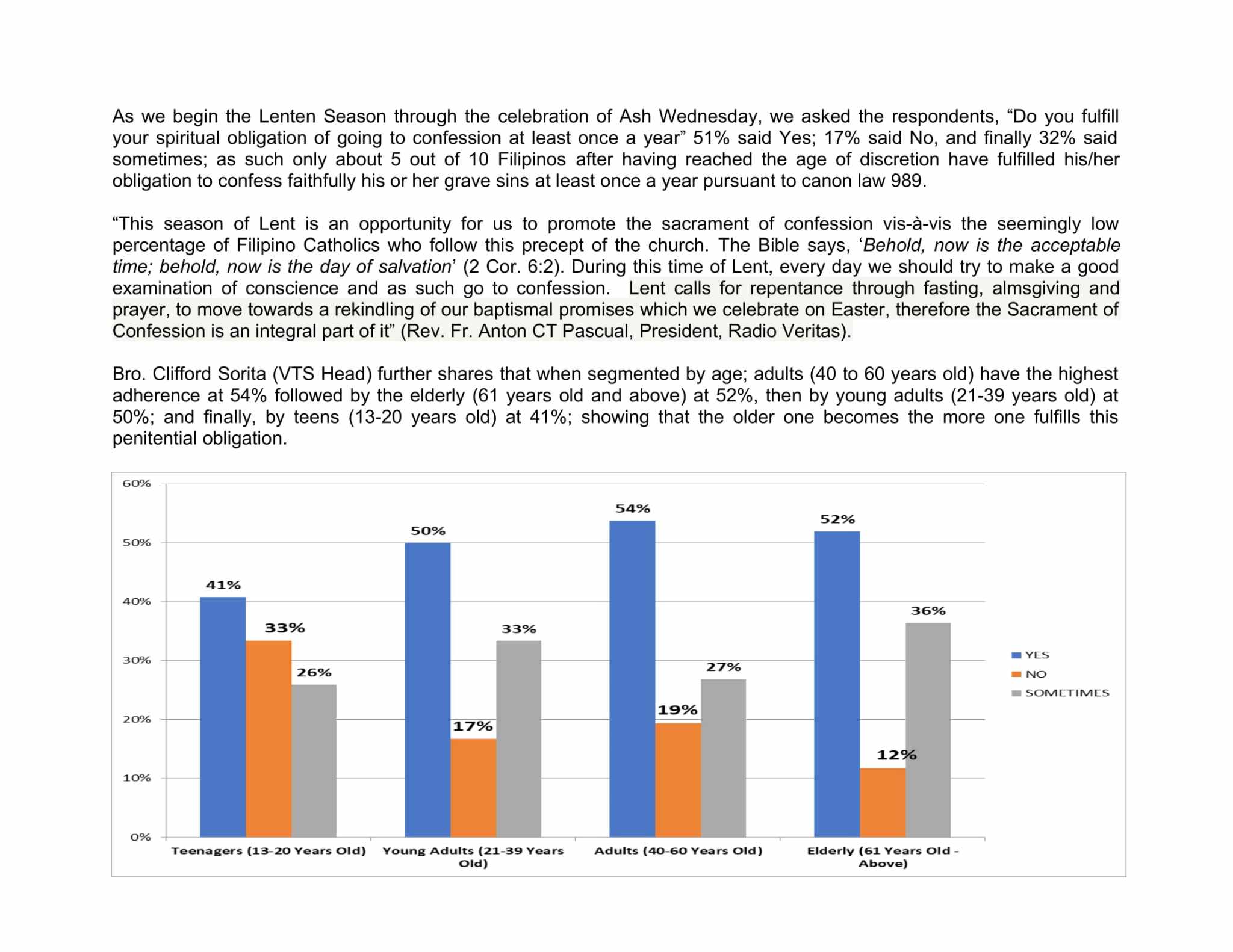 Sa isinagawang pag-aaral ng Veritas Truth Survey, naitala ang 51-porsyento sa 1, 200 respondents ang nangungumpisal isang beses sa isang taon partikular na ang mga nasa wastong gulang batay sa isinasaad sa canon law 989.