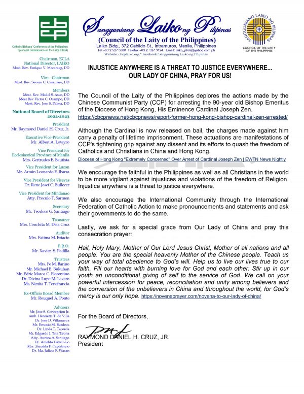 “The Council of the Laity of the Philippines deplores the actions made by the Chinese Communist Party (CCP) for arresting the 90-year old Bishop Emeritus of the Diocese of Hong Kong, His Eminence Cardinal Joseph Zen. Although the Cardinal is now released on bail, the charges made against him carry a penalty of lifetime imprisonment. These actuations are manifestations of CCP’s tightening grip against any dissent and its efforts to quash the freedom of Catholics and Christians in China and Hong Kong,” pahayag ni Cruz.