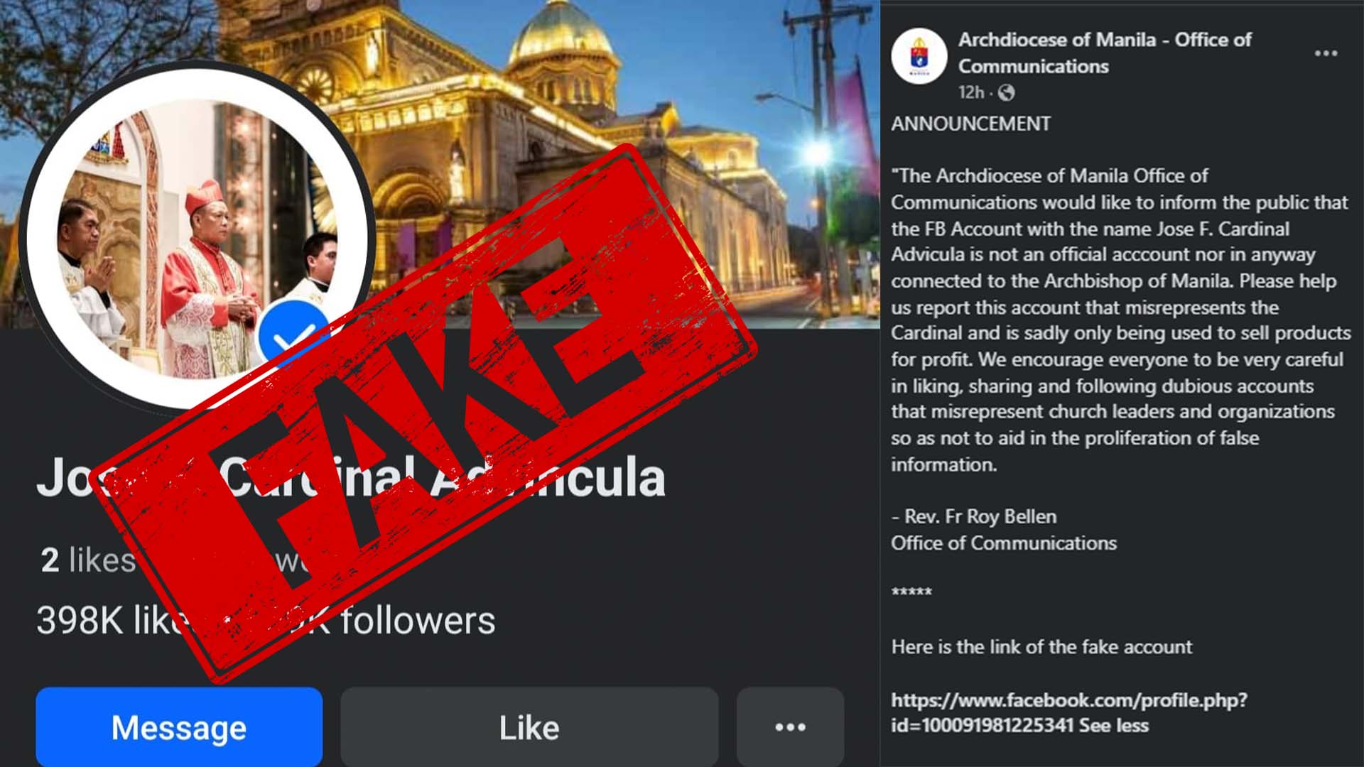 “The Archdiocese of Manila Office of Communications would like to inform the public that the FB Account with the name Jose F. Cardinal Advicula is not an official acccount nor in anyway connected to the Archbishop of Manila. Please help us report this account that misrepresent the Cardinal and is sadly only being used to sell products for profit,” pahayag ni Fr. Bellen.