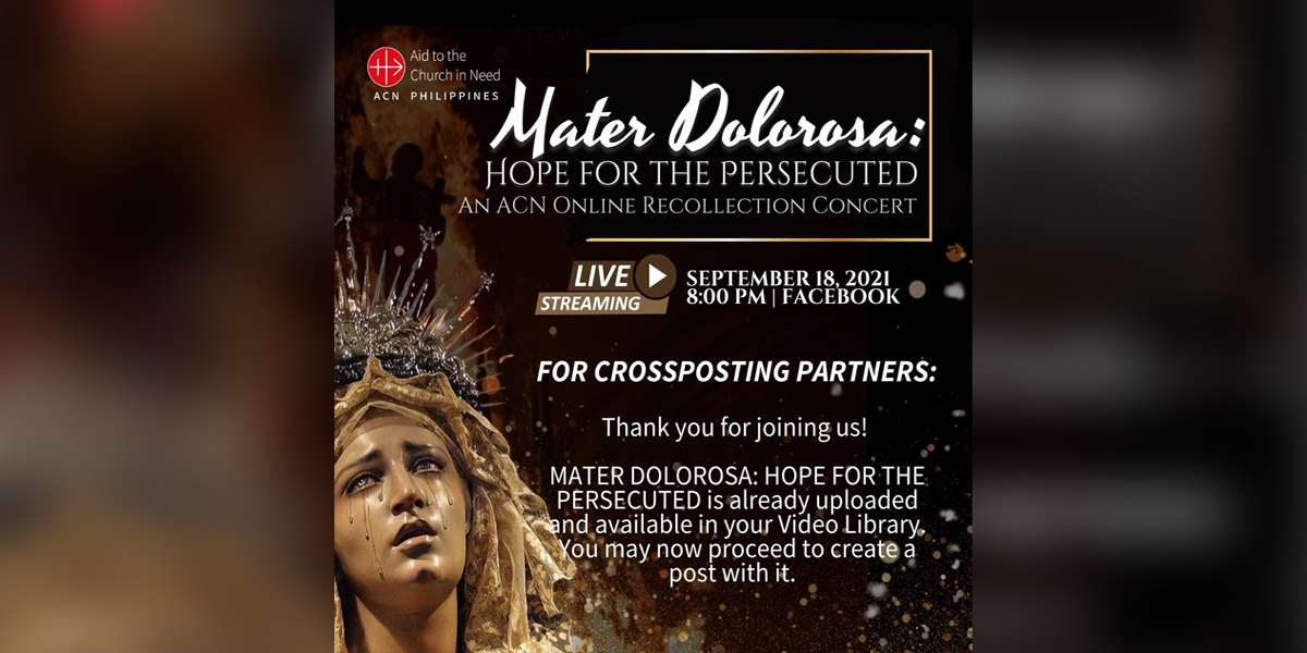 Inaanyayahan ng sangay ng pontifical foundation ng Vatican sa bansa na Aid to the Church in Need Philippines ang bawat mananampalataya na makibahagi sa MATER DOLOROSA: HOPE FOR THE PERSECUTED – An ACN Online Recollection Concert sa ika-18 ng Setyembre, 2021.