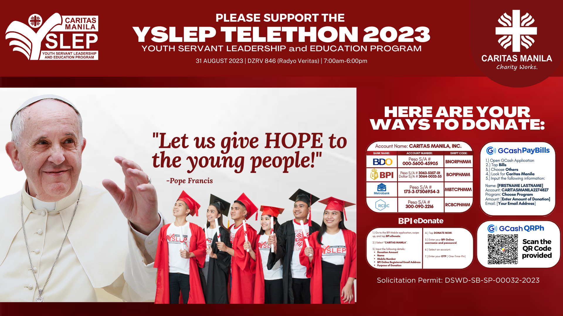 Inaanyayahan ni Father Anton CT Pascual – Executive Director ng Caritas Manila at Pangulo ng Radio Veritas ang mamamayan na makiisa sa Youth Servant Leadership and Education Program telethon sa ika-31 ng Agosto 2023 simula alas-siete ng umaga hanggang ala-sais ng gabi.