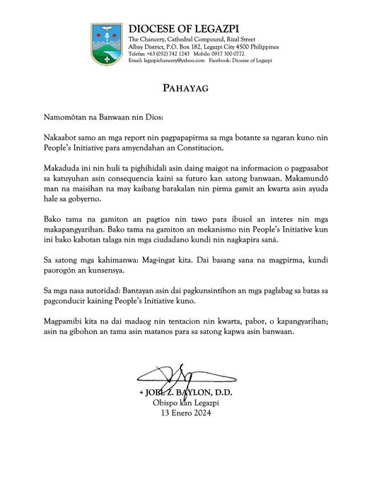 Bilang pag-iingat nanawagan ang Diyosesis ng Legazpi sa bawat mamamayan na maging maingat at mapanuri sa mga impormasyong kumakalat partikular na sa paglagda sa anumang petisyon lalo’t higit nakasalalay dito ang kinabukasan ng bayan.