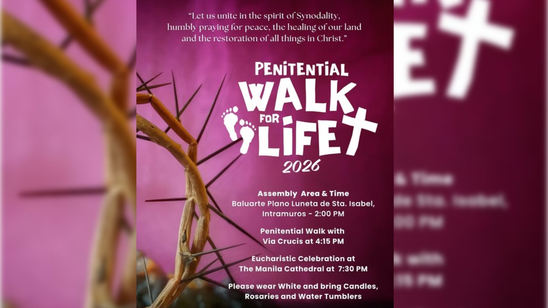 Sa ilalim ng pangkabuuang tema ng Penitential Walk for Life 2026 na “Walk for Life! Walk for Unity as One Nation!” ay umaasa ang Sangguniang Laiko ng Pilipinas na makiisa ang mga mananampalataya mula sa iba’t ibang diyosesis sa mariing paninindigan para sa pagsusulong ng dignidad at kasagraduhan ng buhay, laban sa anumang banta laban sa buhay ng tao at maging ng kalikasan.