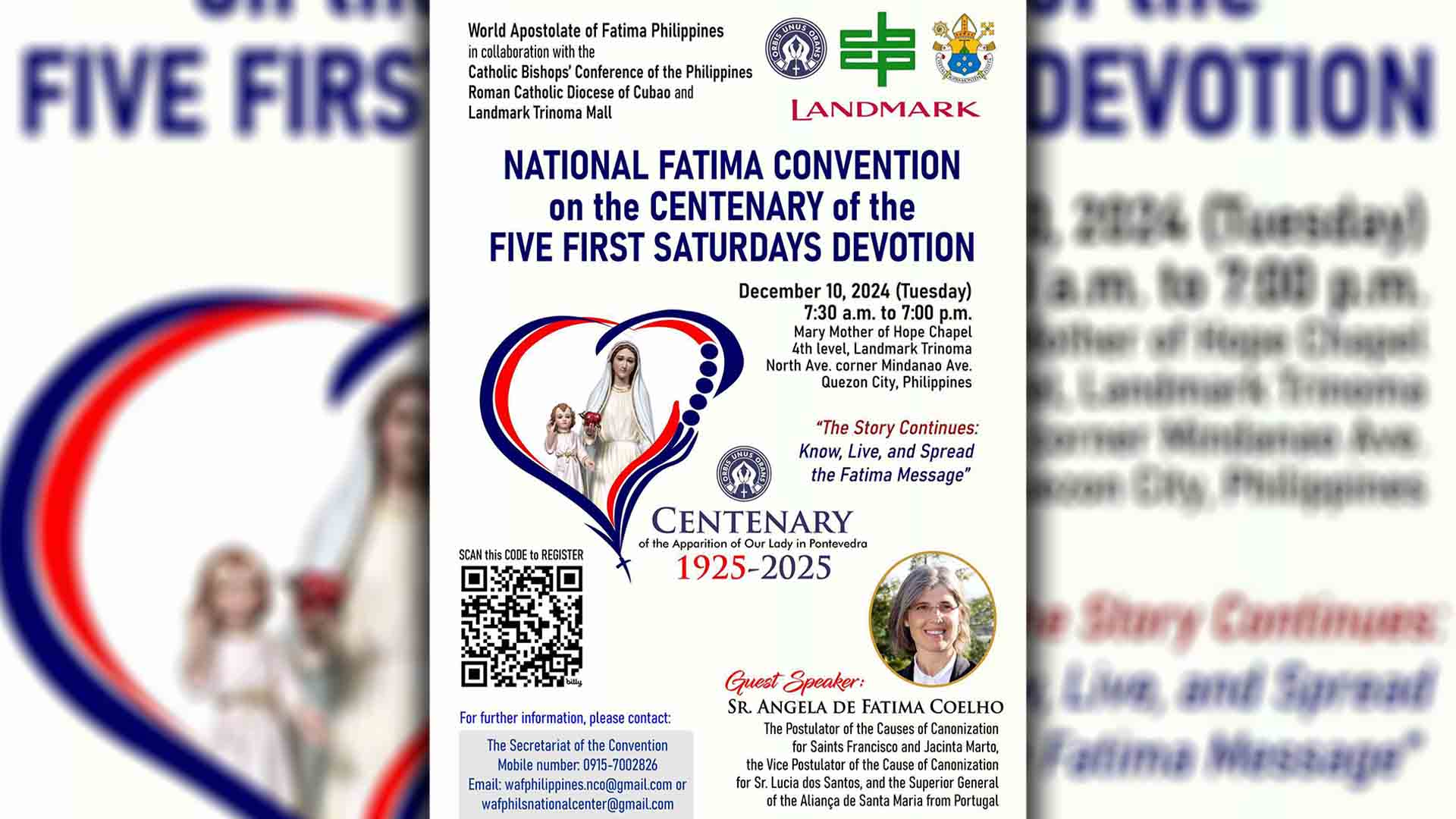 Tampok sa national convention na isasagawa sa mary Mother of Hope Chapel ng Landmark-Trinoma ang panayam ni Sr. Angela de Fatima Coelho, ang Postulator ng Causes of Canonization nina San Francisco at Santa Jacinta Marto, Vice Postulator ng Cause of Canonization naman kay Sr. Lucia, at kasalukuyang Superior General ng Aliança de Santa Maria, Portugal.