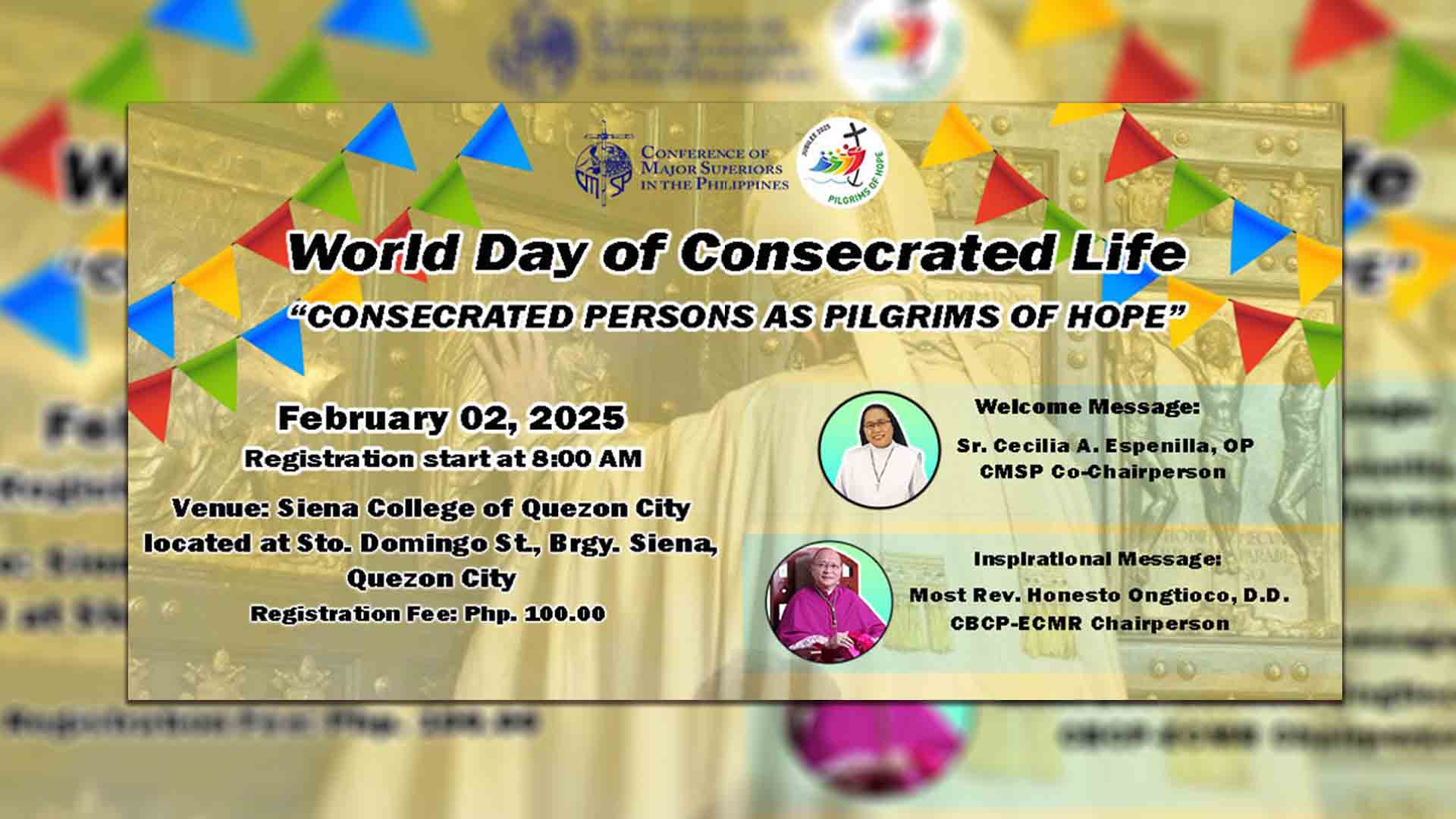 Ilan sa magbibigay ng mensahe si Sr. Cecilia Espenilla, OP ang kasalukuyang Co-Chairperson ng CMSP, Cubao Bishop Emeritus Honesto Ongtioco ang chairperson ng Episcopal Commission on Mutual Relations Between Bishops and Religious ng Catholic Bishops’ Conference of the Philippines.