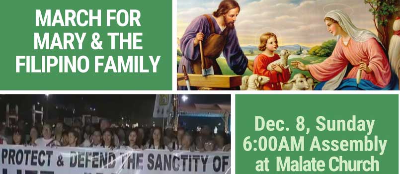 Ang March for Mary and Filipino sa linggo ika-8 ng Disyembre ay magsisimula sa Malate church ganap na alas sais ng umaga.