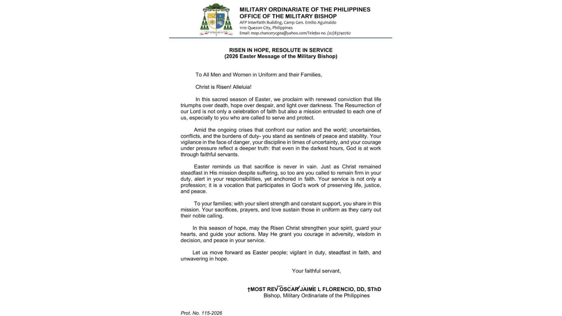 “Easter reminds us that sacrifice is never in vain. Just as Christ remained steadfast in His mission despite suffering, so too are you called to remain firm in your duty, alert in your responsibilities, yet anchored in faith. Your service is not only a profession; it is a vocation that participates in God’s work of preserving life, justice, and peace.” Ayon pa kay Bishop Florencio.