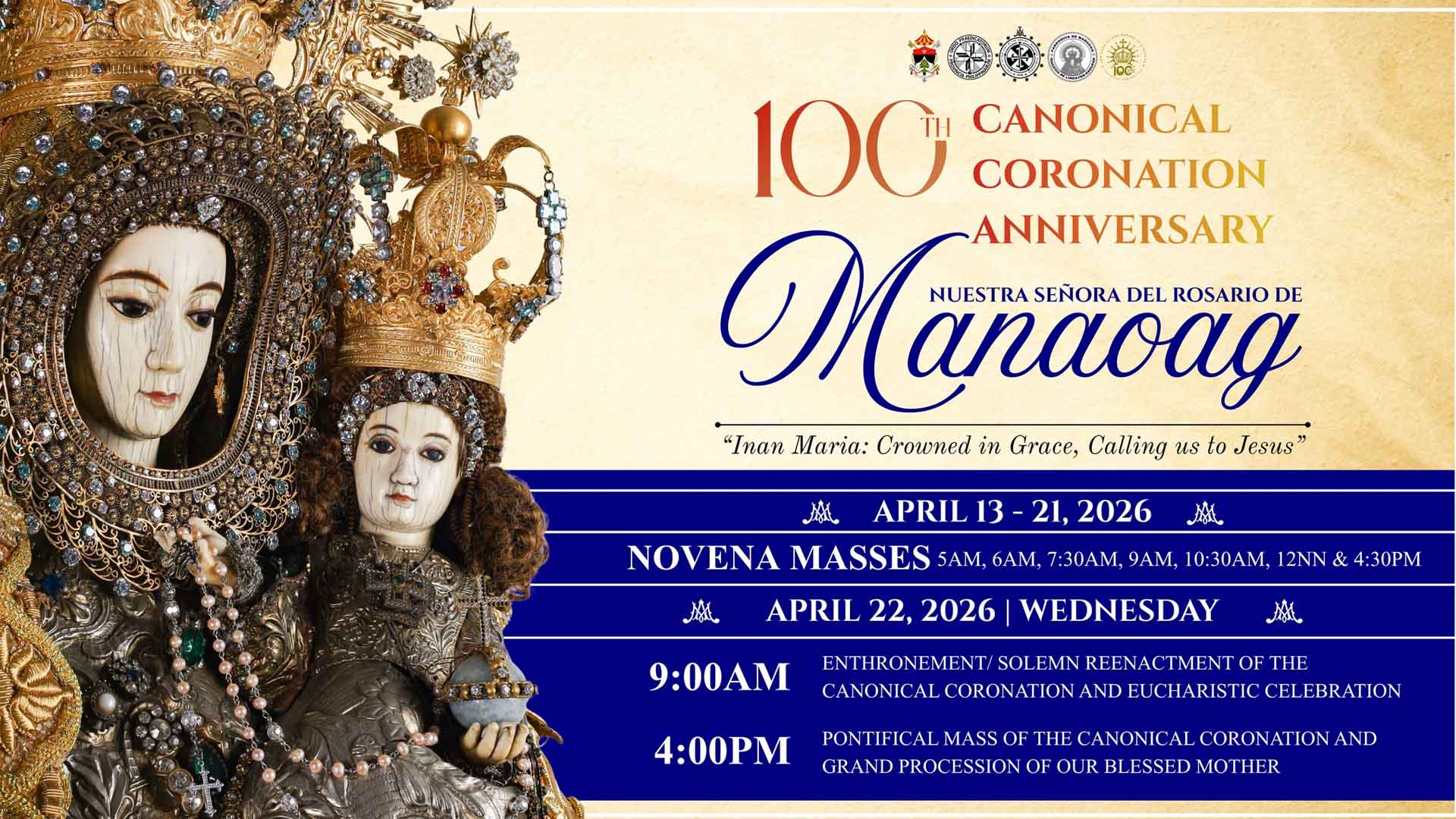 Sa April 22, 2026, isasagawa ang maringal at makabuluhang selebrasyon, ganap na alas-9 ng umaga ang Pontifical Mass at pagsasariwa sa pagputong ng korona sa imahe na pangungunahan ni Papal Nuncio to the Philippines, Archbishop Charles John Brown, habang magbabahagi ng pagninilay si Manila Archbishop Jose Advincula.
