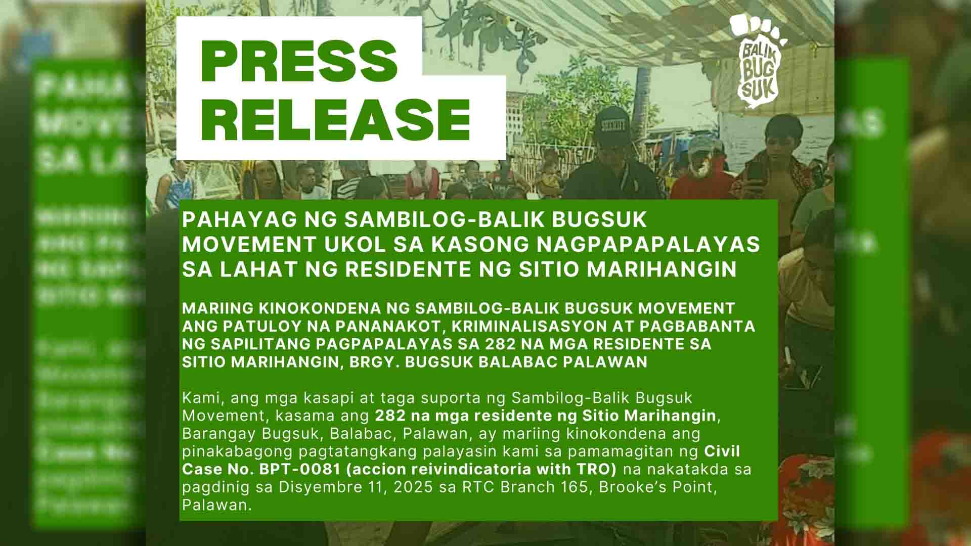 Mariing kinondena ng Sambilog-Balik Bugsuk Movement ang patuloy na pananakot, pang-uusig, at banta ng sapilitang pagpapalayas sa 282 residente ng Sitio Marihangin, Barangay Bugsuk, Balabac, Palawan, kaugnay ng isinampang kaso na nakatakda sa pagdinig ngayong December 11, 2025 sa Brooke’s Point Regional Trial Court.