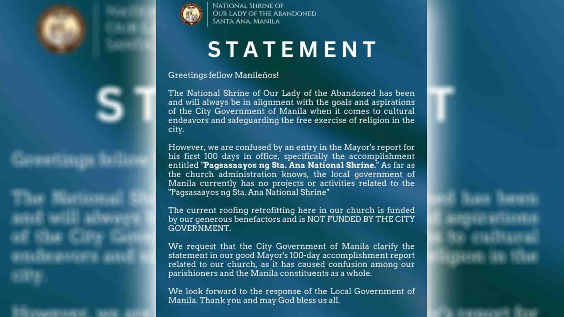 Nilinaw ng National Shrine of Our Lady of the Abandoned sa Santa Ana, Maynila na walang anumang proyekto o aktibidad ang lokal na pamahalaan sa Simbahan.