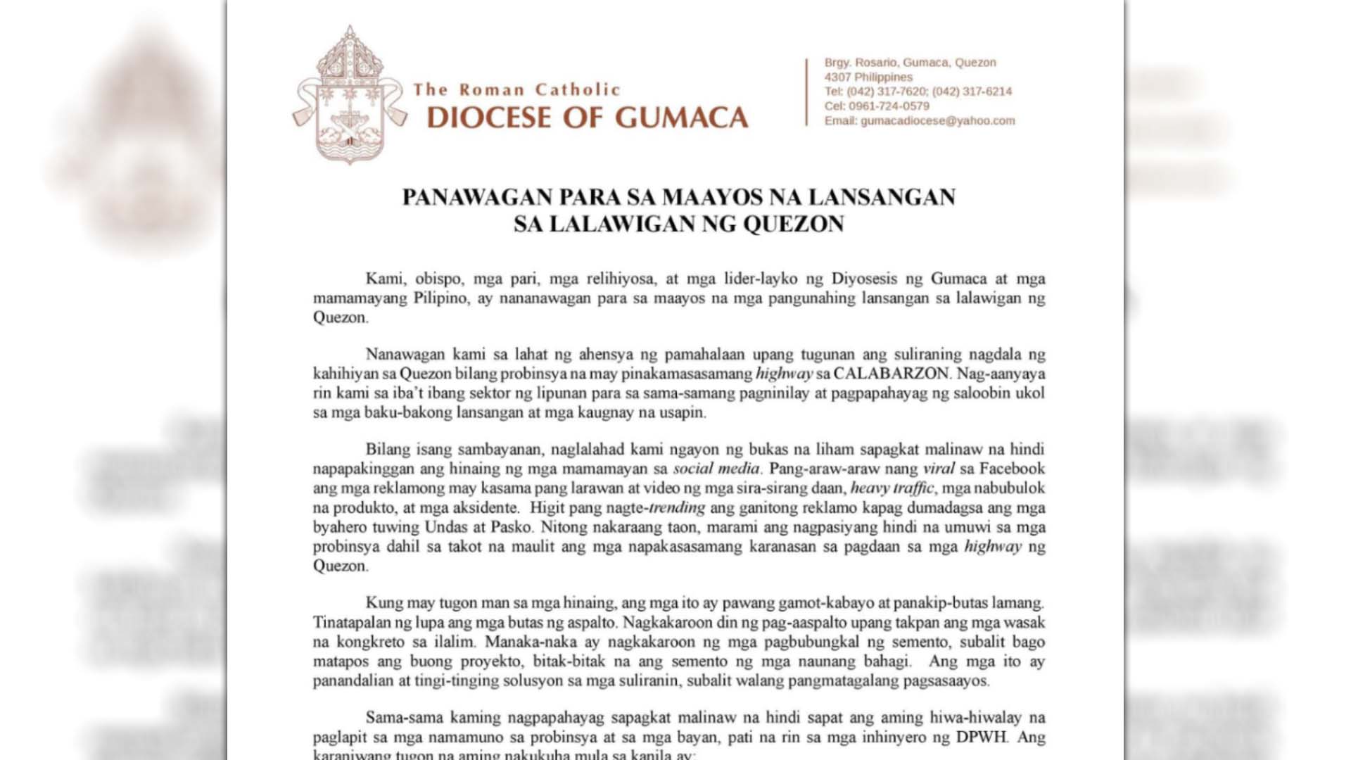 Kaugnay ito sa inilabas na liham ng diyosesis bilang panawagan para sa maayos na mga pangunahing lansangan sa lalawigan ng Quezon.
