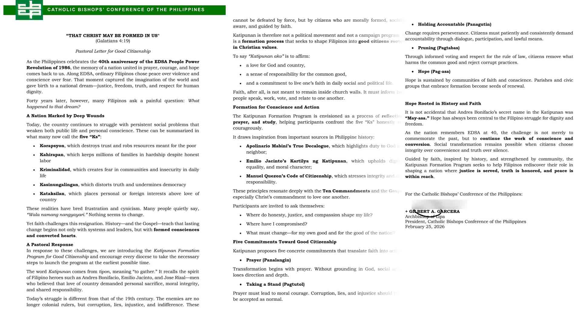 Sa liham pastoral na pinamagatang “That Christ May Be Formed In Us” (Galatians 4:19): Pastoral Letter For Good Citizenship, binalikan ng Arsobispo ang alaala ng isang bansang nagkaisa sa pananalangin, tapang, at pag-asa sa kahabaan ng EDSA kung saan pinili ng mga ordinaryong Pilipino ang kapayapaan at konsensya kaysa karahasan at takot.