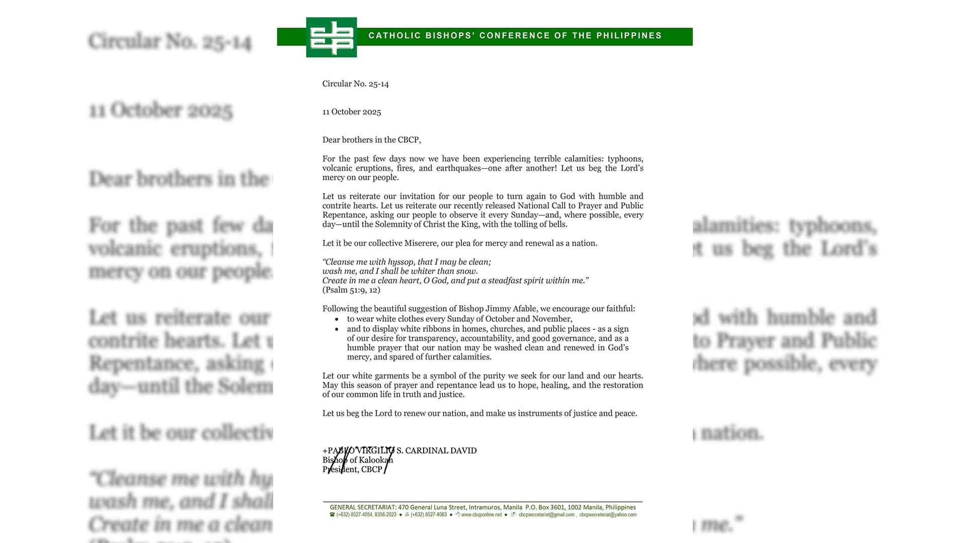 Sa inilabas na Circular No. 25-14, hinikayat ni CBCP President, Kalookan Bishop Pablo Virgilio Cardinal David, ang lahat ng simbahan at pamayanang Kristiyano na magmamakaawa sa awa ng Panginoon para sa ating bayan, at sabay-sabay manalangin para sa kapatawaran at panibagong pag-asa ng bansa.
